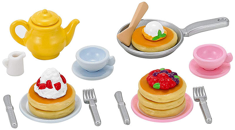 What could be better than pancakes? This set is suitable for making breakfast for the whole family. Including six pancakes and three kinds of delicious toppings, it has everything the sylvanians need to make and nibble on these yummy breakfast treats. It includes utensils, cutlery and a teapot too of course - you can't have pancakes without tea.