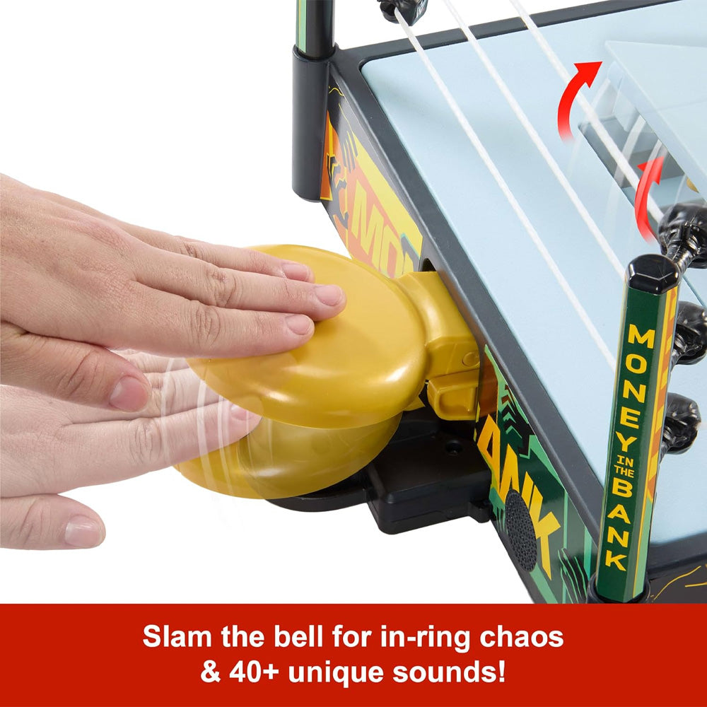Let the ring decide the fate of favorite WWE Superstars with the Money In The Bank Cash-In Ring playset! Two modes let kids create unpredictable finishes. Slide the bell out to Money In The Bank Mode and send figures flying towards the briefcase suspended above the ring. Slam the bell in for Kick Out Mode and send WWE action figures (sold separately) for the pin -- the ring randomly decides if the pinfall results in a 3-count or kickout. More than 40 sounds and phrases take play to the next level, and included accessories deliver even more surprising moves! Figures sold separately, subject to availability. Colors and decorations may vary.