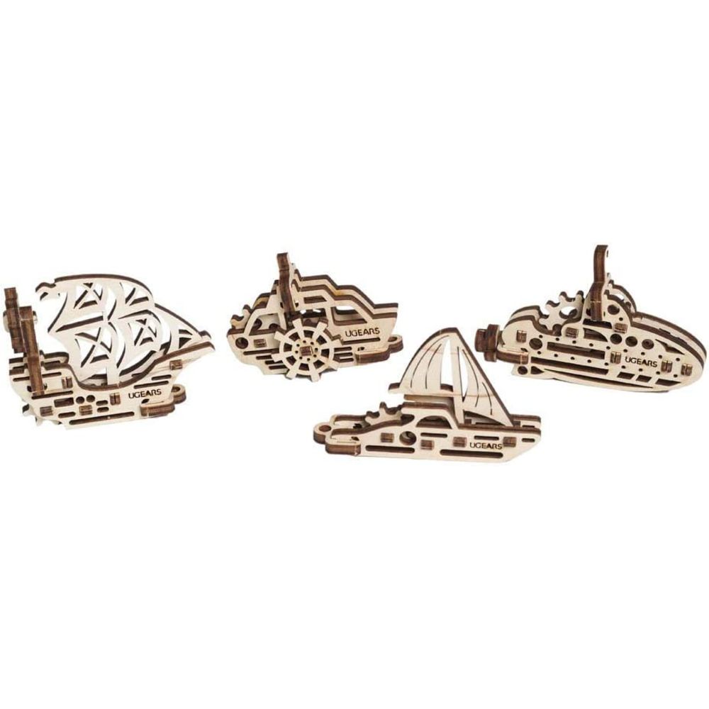 The unique set of 4 individual miniature models for self-assembly for grown-ups and kids from 5 years to 80 and beyond. The set includes Sailing yacht, Sailboat, Boat, Submarine with basic elements of mechanics.