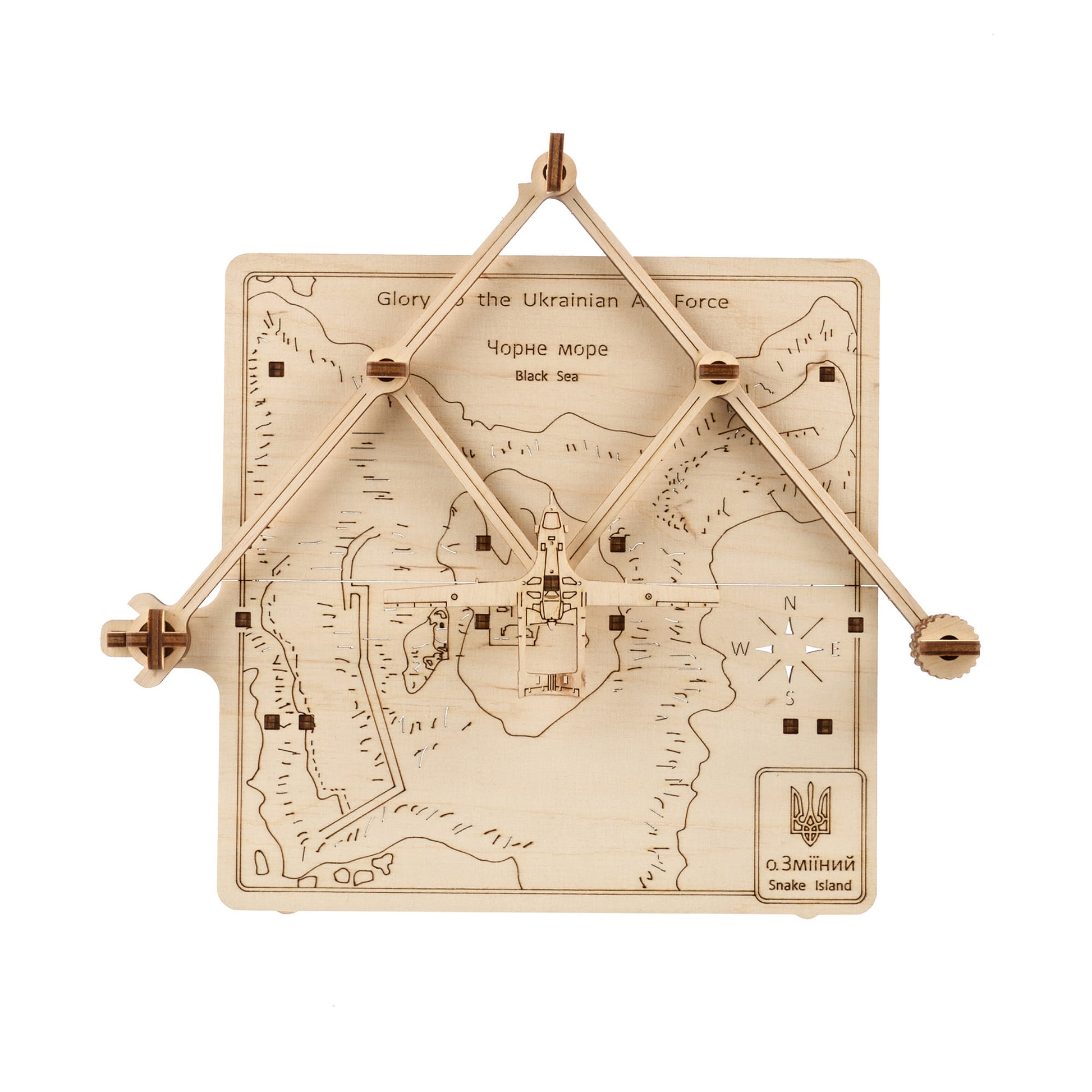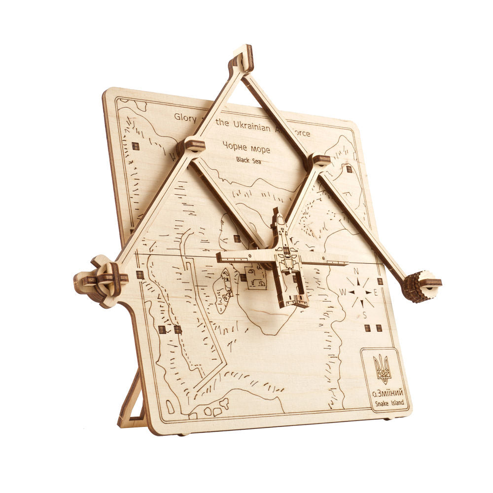 The Liberation of Snake Island model is a mechanical depiction of a Bayraktar unmanned combat aerial vehicle flying over Ukraine's Snake Island on the Black Sea, which was captured by the russians on February 24 and liberated on July 7. With a pantograph-type system, you can move the Bayraktar over the map of the island. There are legs on the back of the model so you can put your mechanical model in a prominent place and enjoy it with your family and friends.