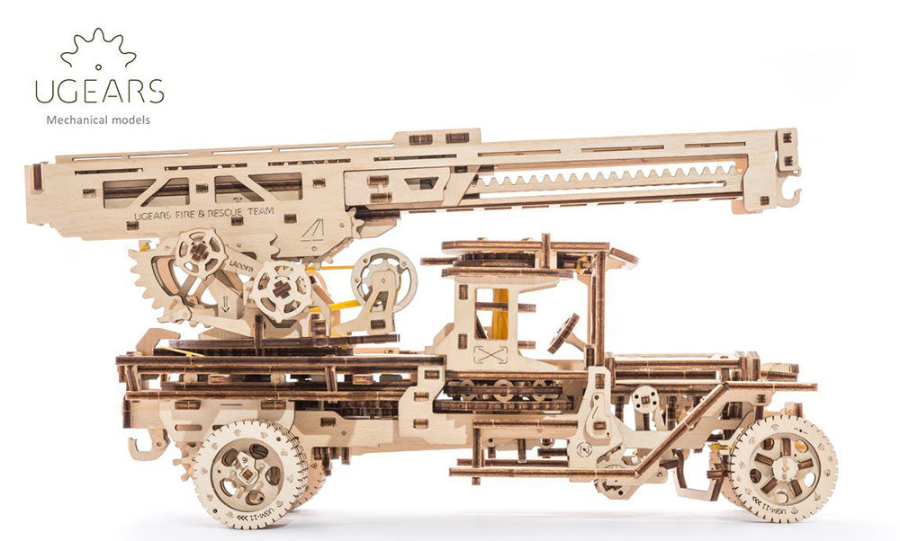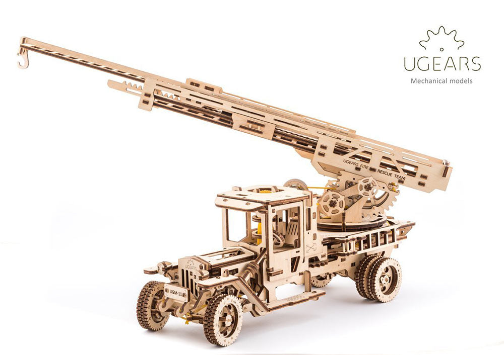 Fire Ladder Truck The Fire Truck is a self-propelled wooden model from the new UGEARS Trucks collection. Intelligent design mixed with smart engineering inside. The Fire Truck functions like a real Rescue & Fire Truck with turning foot and extension ladder which transforms into real crane with a hook!