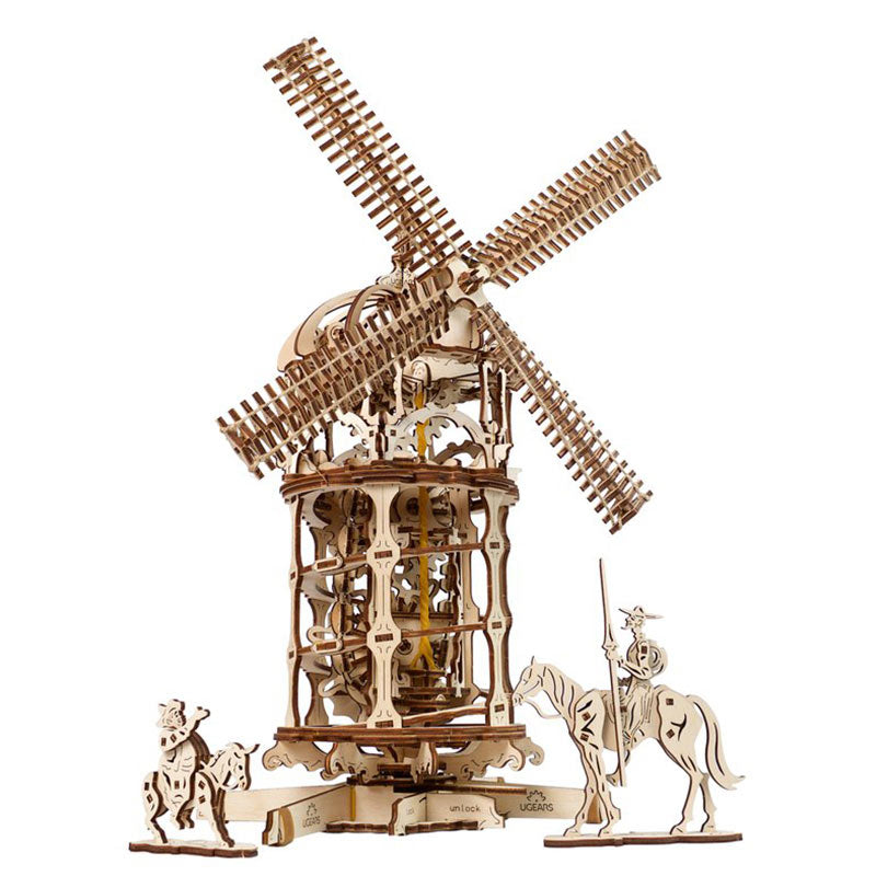While taking origin from the English prototype, the Ugears model also addresses the Spanish classic: the Tower Windmill comes with the figures of the Ingenious Nobleman Don Quixote and his quirky companion Sancho Panza. The Ugears Tower Windmill model kit is made of sustainable sourced high grade wood and has everything you might need for assembly. The quality of the parts is top-notch: a laser method is used for cutting items from a plywood board that provides precise hairline cuts. The details have to be pulled out of the boards and assembled to create a complete model. Like all other Ugears models, the Tower Windmill comes with step-by-step, full-color, truly easy to follow instructions in 11 languages (English, German, Ukrainian, French, Polish, Spanish, Russian, Turkish, Italian, Chinese and Korean) and requires neither glue nor special tools to be fully assembled into functional working Windmill.