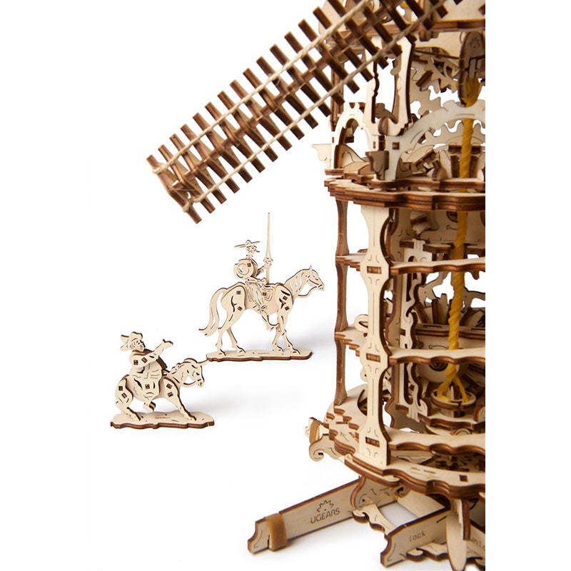 While taking origin from the English prototype, the Ugears model also addresses the Spanish classic: the Tower Windmill comes with the figures of the Ingenious Nobleman Don Quixote and his quirky companion Sancho Panza. The Ugears Tower Windmill model kit is made of sustainable sourced high grade wood and has everything you might need for assembly. The quality of the parts is top-notch: a laser method is used for cutting items from a plywood board that provides precise hairline cuts. The details have to be pulled out of the boards and assembled to create a complete model. Like all other Ugears models, the Tower Windmill comes with step-by-step, full-color, truly easy to follow instructions in 11 languages (English, German, Ukrainian, French, Polish, Spanish, Russian, Turkish, Italian, Chinese and Korean) and requires neither glue nor special tools to be fully assembled into functional working Windmill.