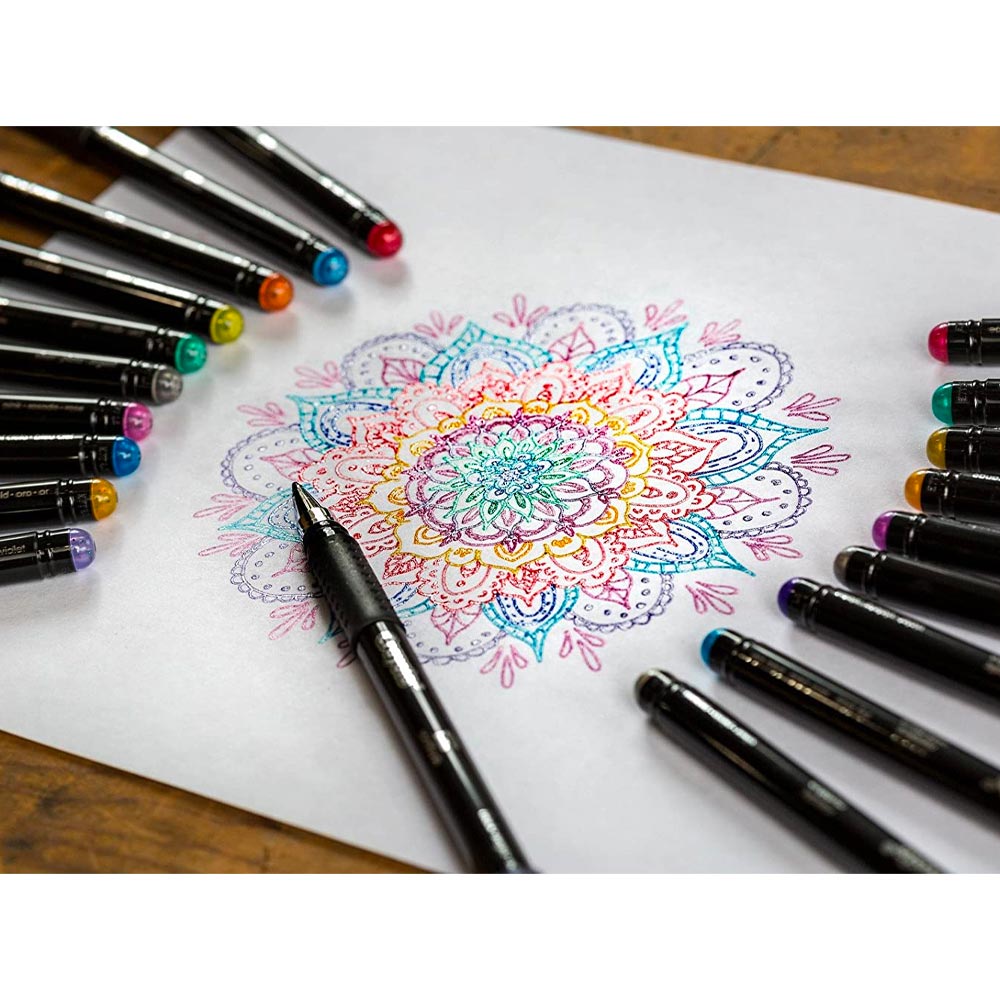 This package contains 20 detailing gel pens in assorted colors within one 7.75x7.75x1.5 inch metal storage tin