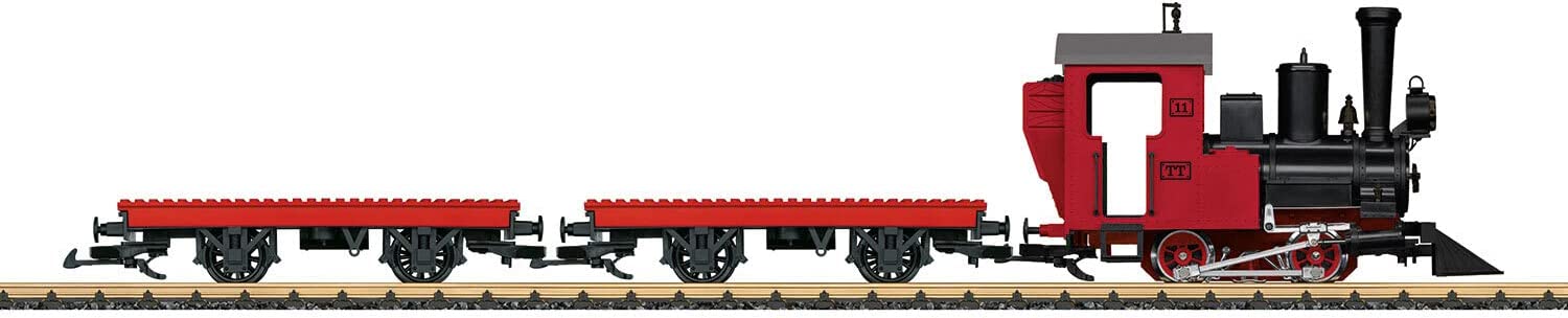 This starter set includes a steam locomotive, two flat cars with a building block plate and 30 building blocks.