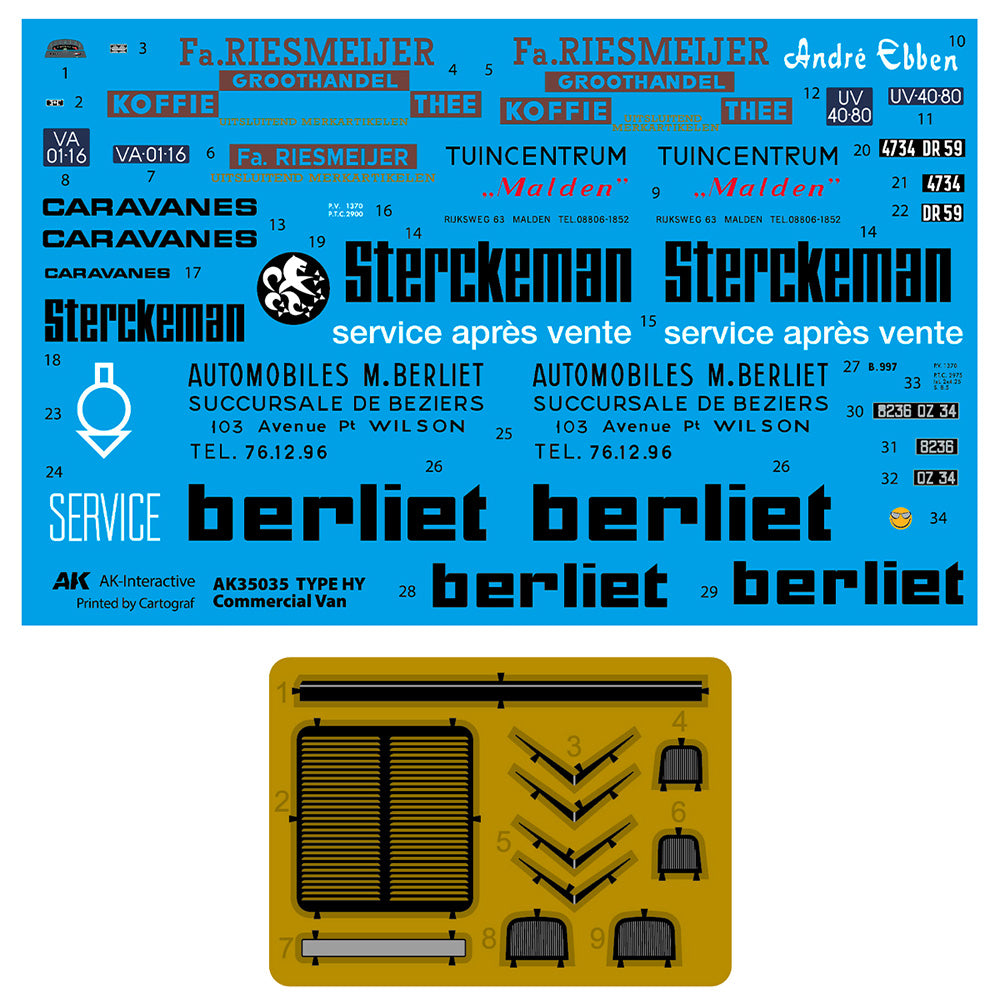 The reference AK35035 represents the panel van from the Type HY series as manufactured from early 1964 to late 1969, with a single windscreen, short chevrons on the radiator grille, vertical handle on the sliding door, and square rear window. The decal sheet includes markings for four colorful vehicles used by private companies from France and the Netherlands.