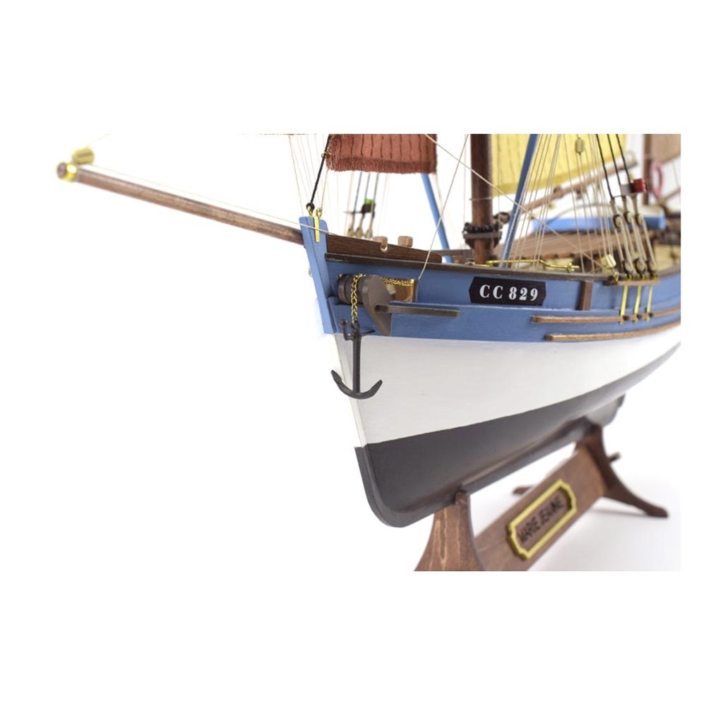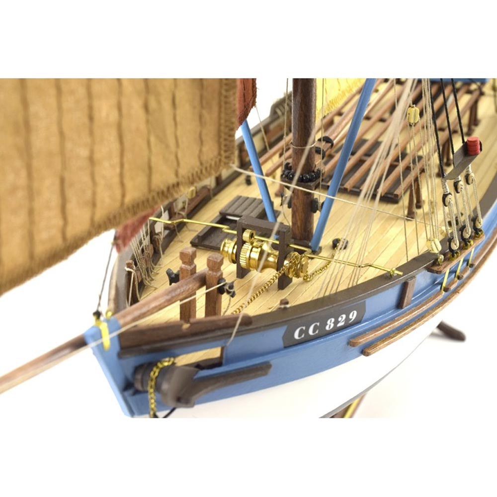 The new wooden model ship of the tuna boat Marie Jeanne has high quality parts for assembly, they fit perfectly: pre-cut board by high precision laser, noble woods, photo-etched parts, brass and die-cast, plus hand-sewn cotton sails ready to be placed. As a gift bonus, this naval modeling kit includes a wooden exhibition base with a metal name plate so that the faithful miniature replica is perfectly exposed once assembled. The modeler can enjoy a much more enjoyable and easy assembly experience with this new scale model. Once assembled, the Marie Jeanne wooden model measures 22.24'' (565 mm) length, 4.52'' (115 mm) width and 19.48'' (495 mm) height.
