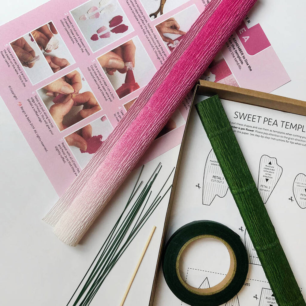 Sweet peas are such a summer favourite and their petals always look so delicate and pretty. The Italian crépe paper in this kit is beautifully vignetted to reflect the different shades found in these blooms. These realistic handmade flowers are much easier to make than you might think and look gorgeous in a vase, framed, on bridal or party accessories, cakes, bouquets and favours, fashion and hair accessories and all around the home too.