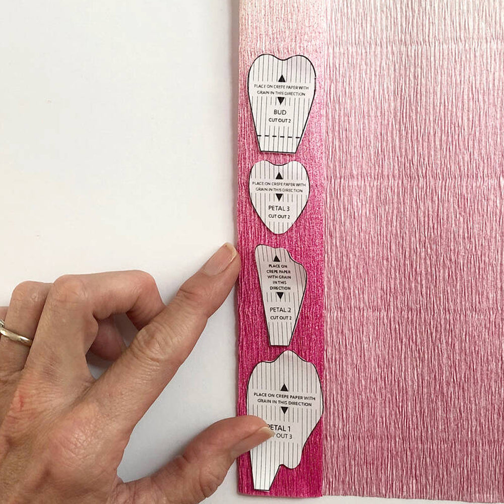 High-quality Italian vignetted crépe paper in pink; floral stub wires in two weights; a set of bespoke templates; full photographic step-by-step instructions to walk you through the project; a roll of floristry tape and a cocktail stick.