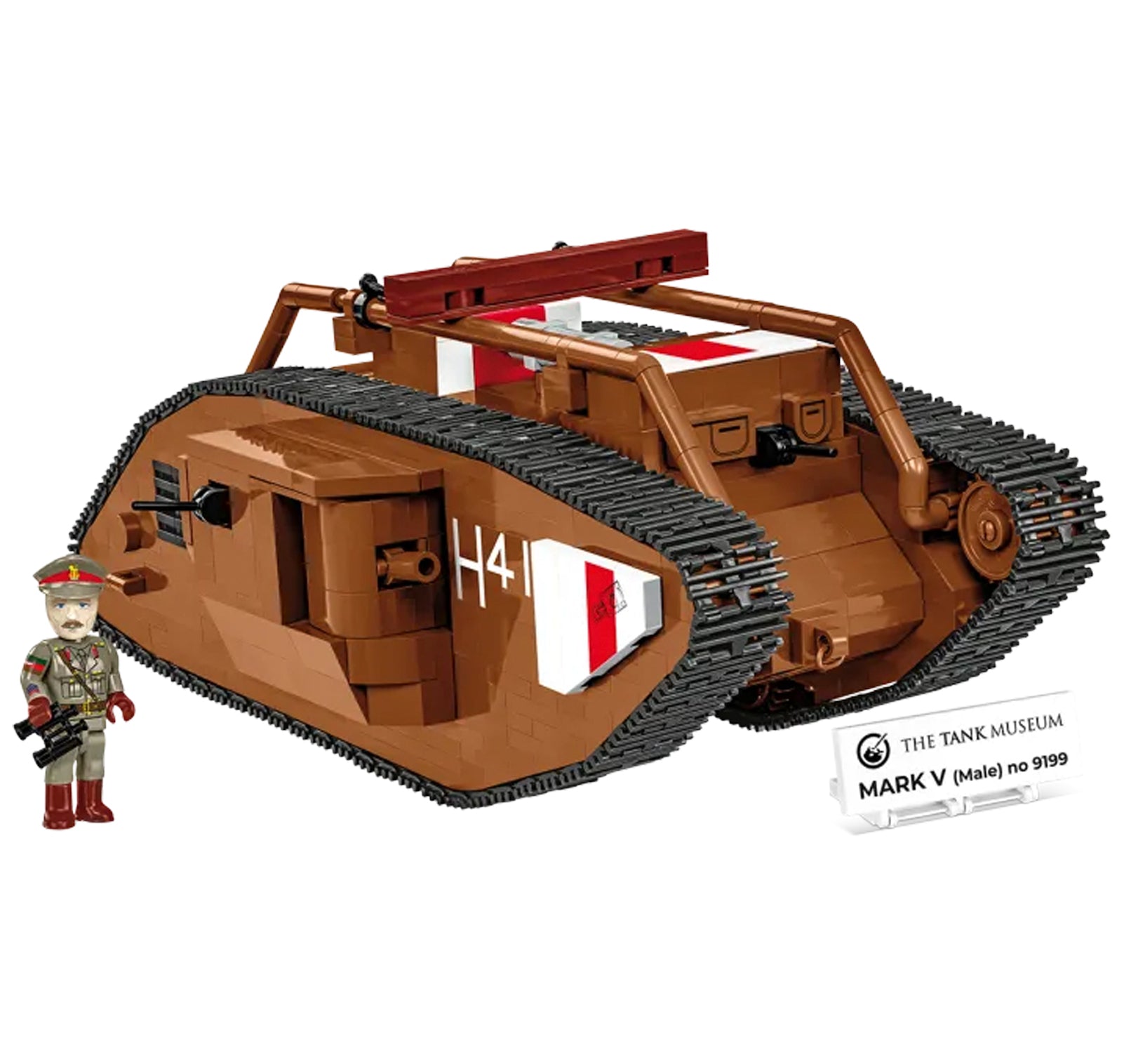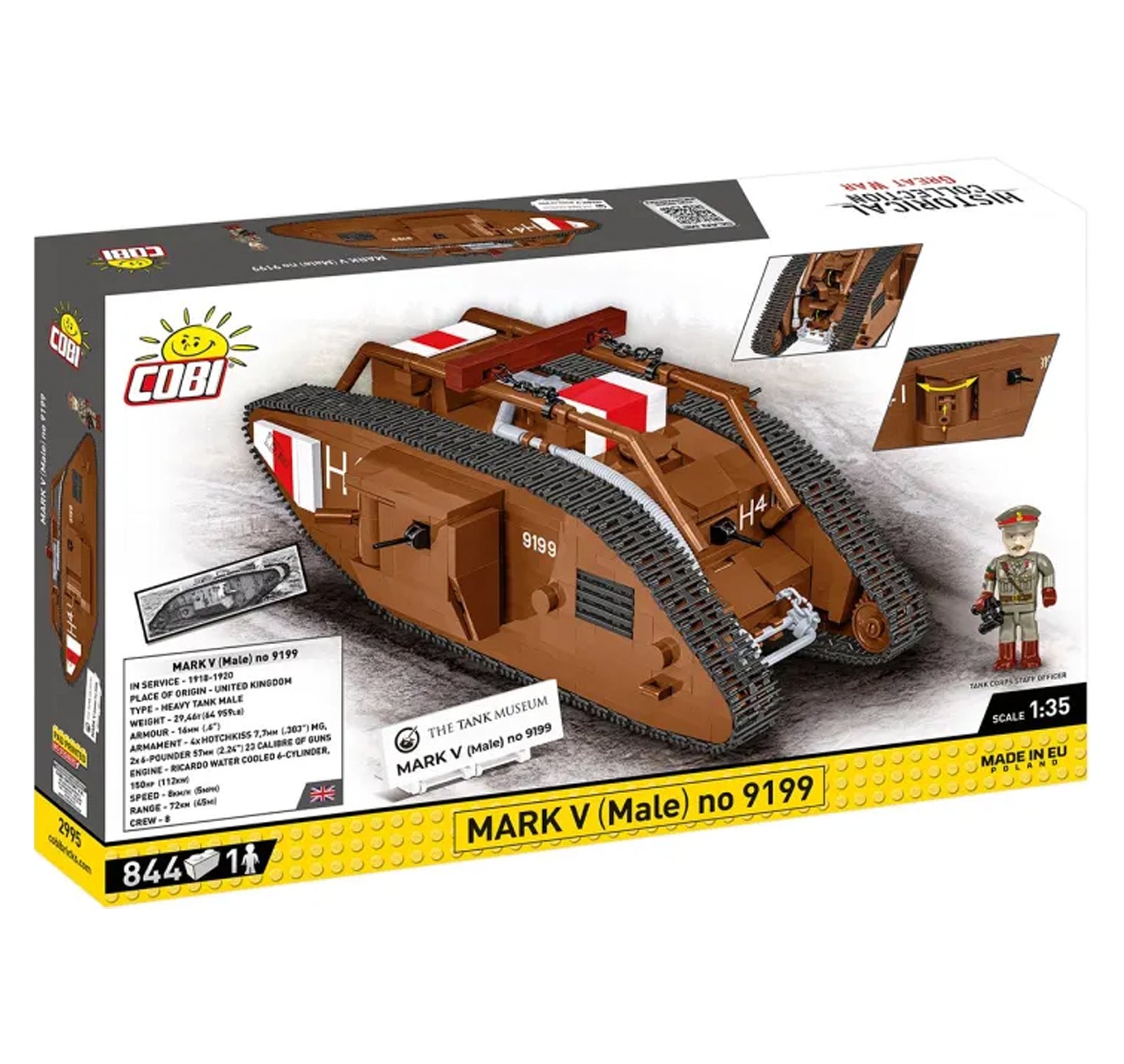 The carefully reproduced model of the MARK V tank (Male) number 9199 consists of 844 COBI construction blocks and is 23cm long. Thanks to the use of the 1:35 model scale, the model fits COBI figures and other vehicles released in this size. The tank is equipped with a working caterpillar traction, rotating cannons and opening hatches. The markings and emblems are made of colorful blocks and durable prints that do not rub off even during intensive use. The set includes a British officer figure and a plate with the name of the set and the logo of The Tank Museum.