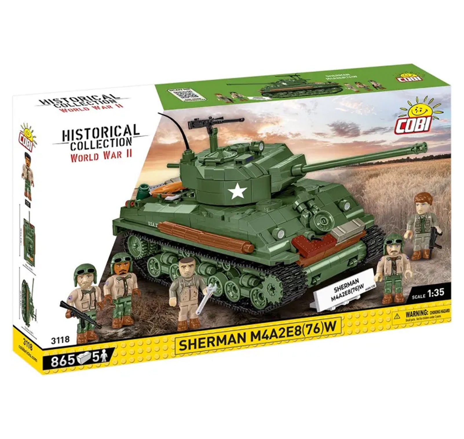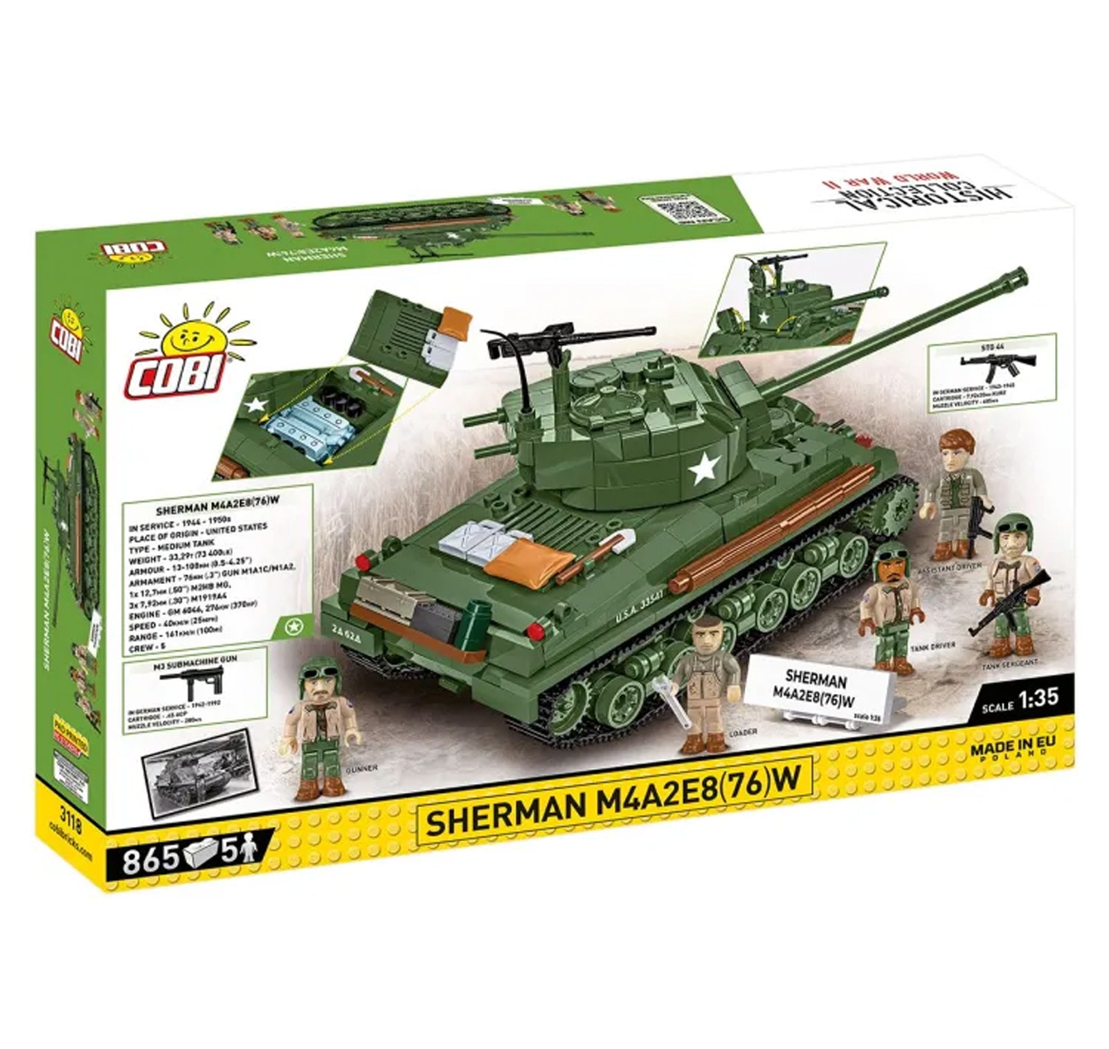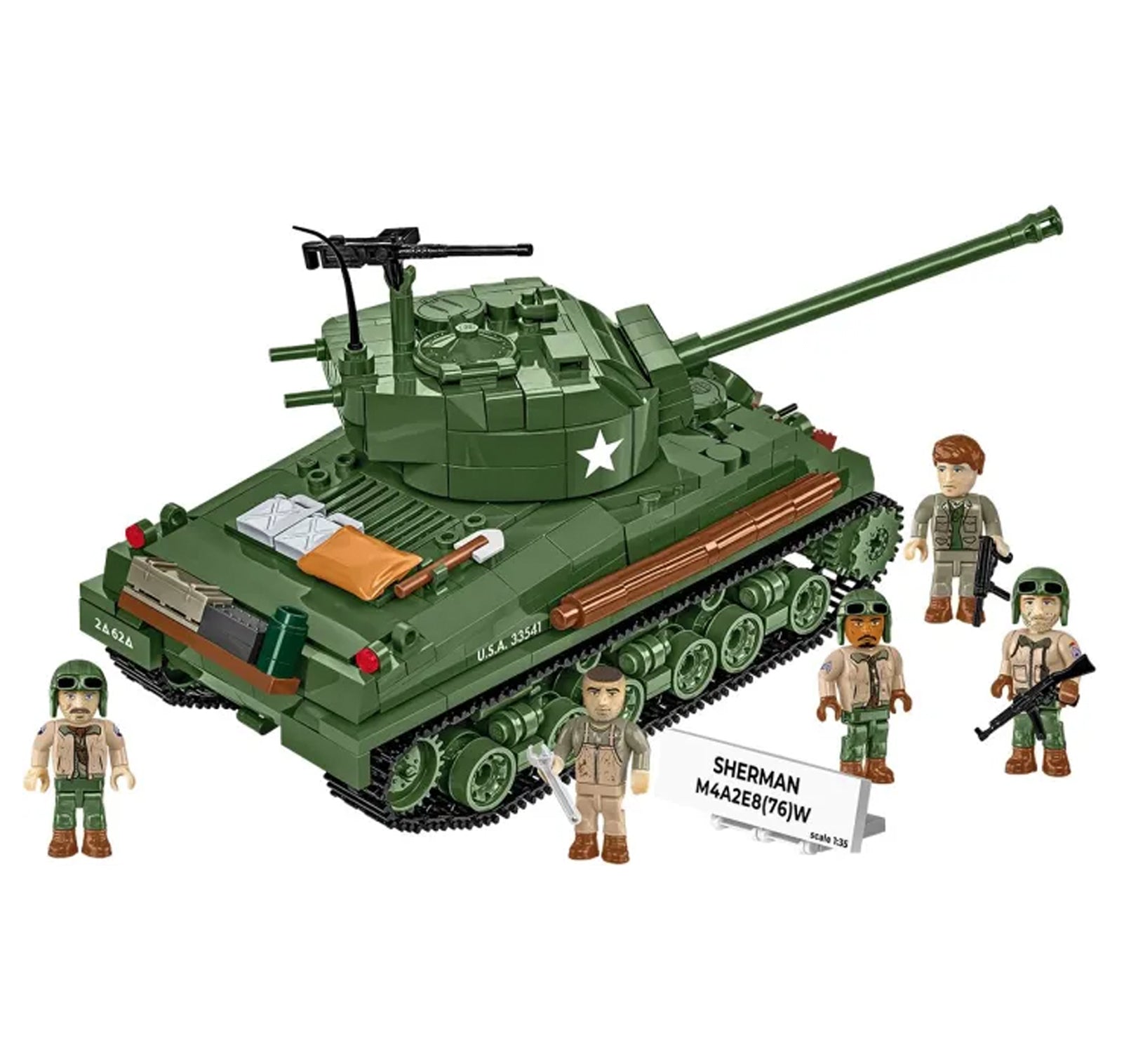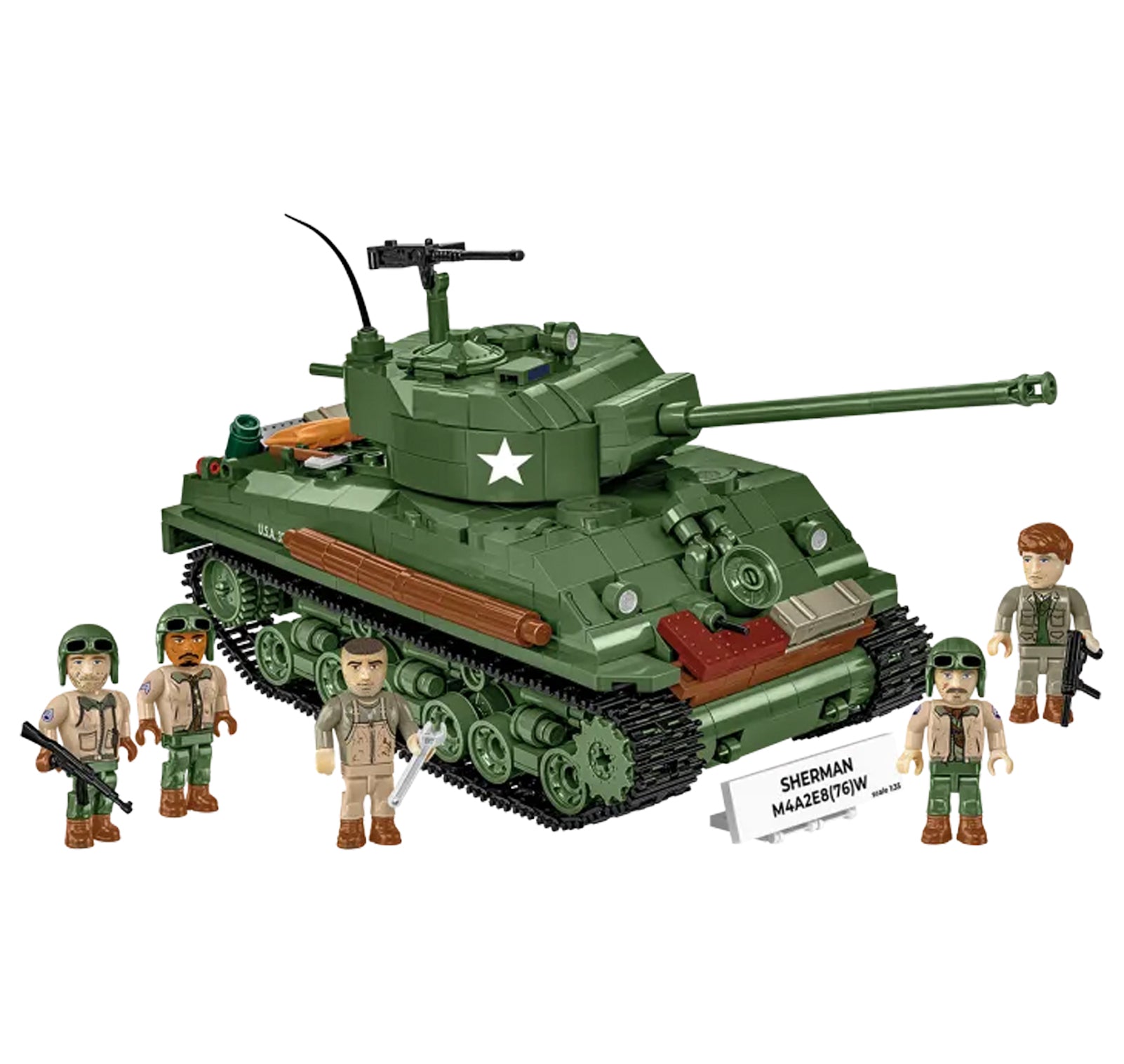 The brick model of the unique Sherman was developed in 1:35 scale and complements the collection of iconic vehicles published as part of the Historical Collection dedicated to World War II. The model, perfectly reproduced from 865 blocks, has working caterpillar traction. You can freely drive it on the floor and watch the working tracks! Move the turret in the range of 360 degrees and take aim by setting the cannon at the selected height. On the turret there is a Browning machine gun, which is an exact copy of the war original. The tank looks very attractive thanks to the many accessories attached to the hull, as well. You can see that it has already spent a long time on the front, and the 5-person crew attached to it are real veterans, about whom one could certainly make more than one film! The realistic figures have a lot of details and will certainly be a very valuable element of your collection! We assure you that each of them has their own style and character. A block plate with the printed name of the tank will help you display your model even better. Build history, piece by piece, with COBI!