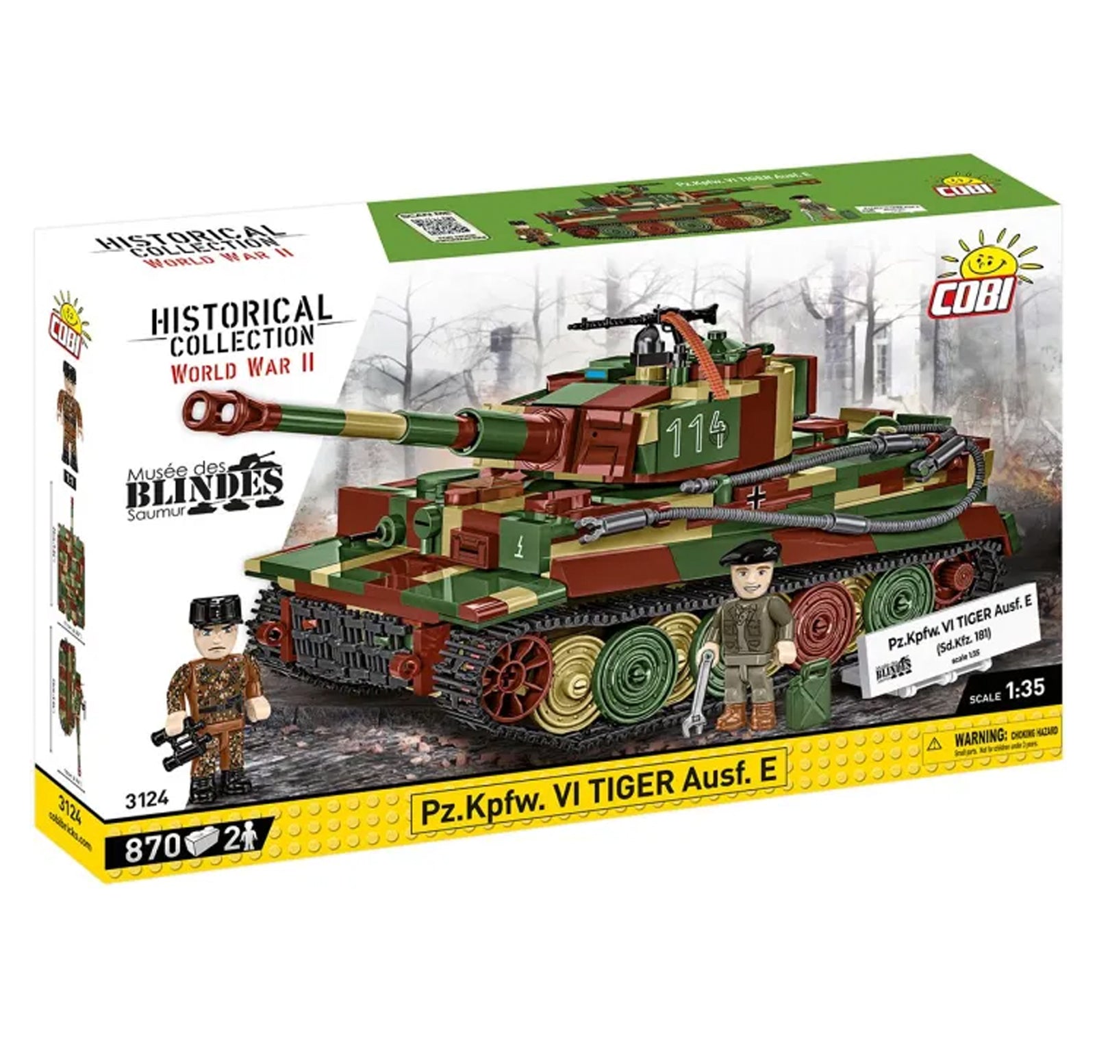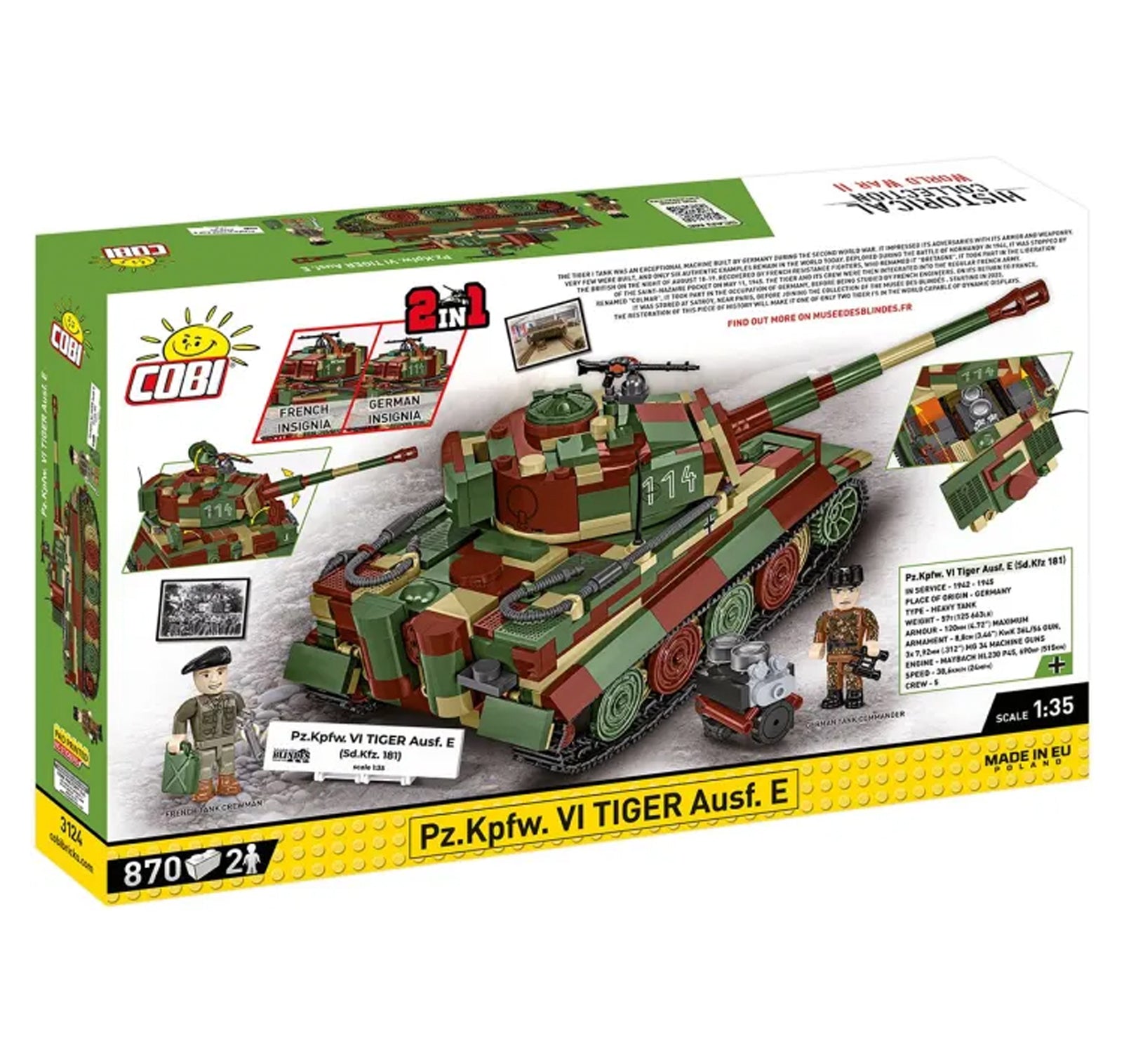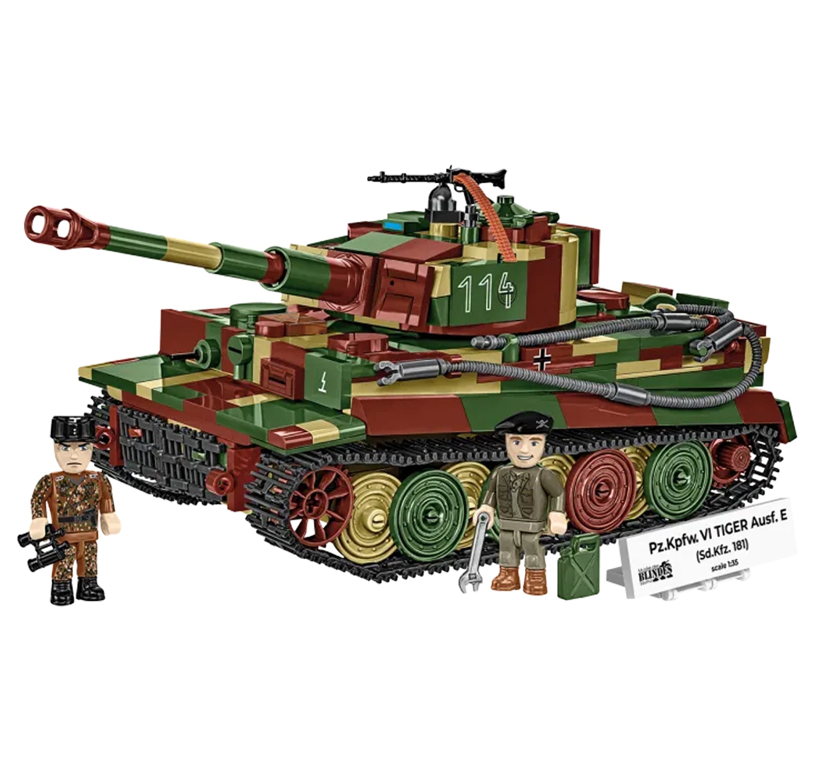 The turret has the tactical number "114". The model's functionalities include a removable block replica of the engine, working tracks, a cannon that can be moved up and down and a rotating turret. Figures can be placed in the opening hatches. The set also includes detailed figures of German and French tankers. The German tanker is dressed in a special camouflage suit, and the Frenchman in a classic tank suit with a beret. Both figures have attractive accessories, such as binoculars, a wrench and a canister.