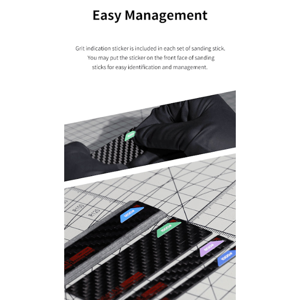 Select the self-adhesive sandpaper of required grit, remove the backing paper and apply to the sanding board and you're ready to go! For sanding sticks less then 25mm in width, excess sandpaper may need trimming to fit.