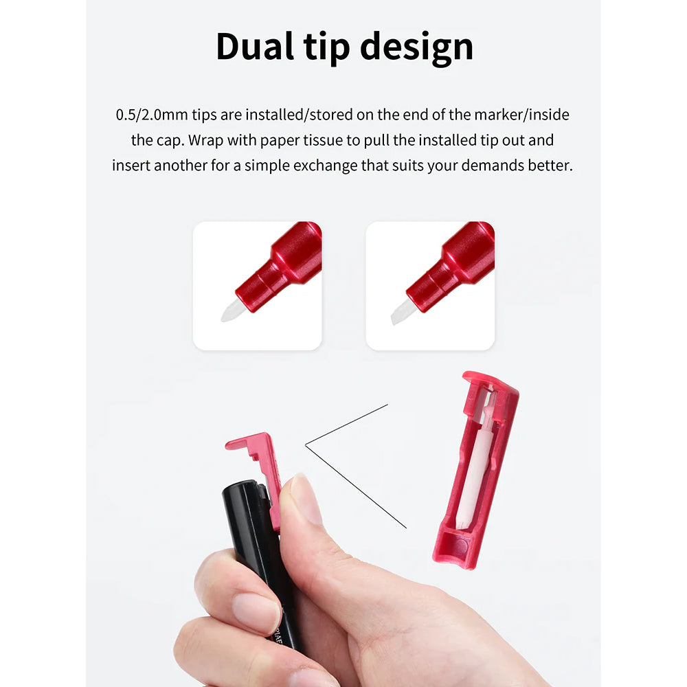 0.5/2mm dual tips to allow for different applications. The spare tip is stored within the lid.