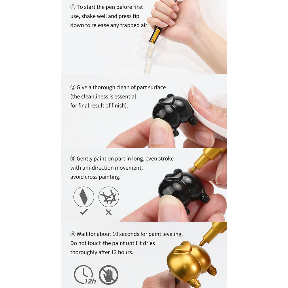 - Shake the pen well and press tip down to release any trapped air. Thoroughly clean the desired area for painting. Gently paint with an even stroke in one direction (avoid cross-painting). Wait 10 seconds for paint levelling and do not touch the paint until it dries thoroughly after around 12 hours.