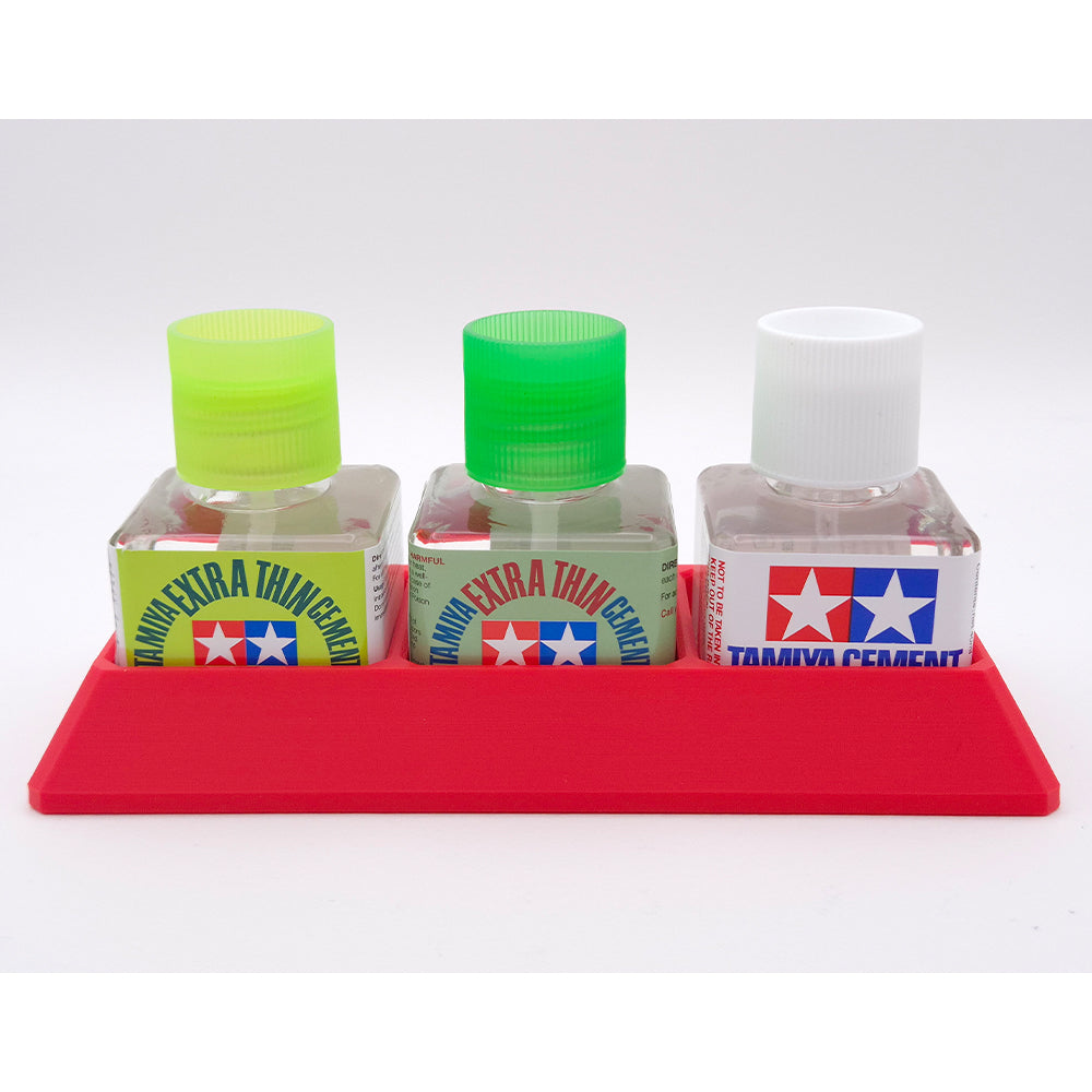 - Custom Fit for Three Tamiya Cement Bottles – Precision-sized to hold standard square bottles like Tamiya Cement, Extra Thin and Quick-Set.