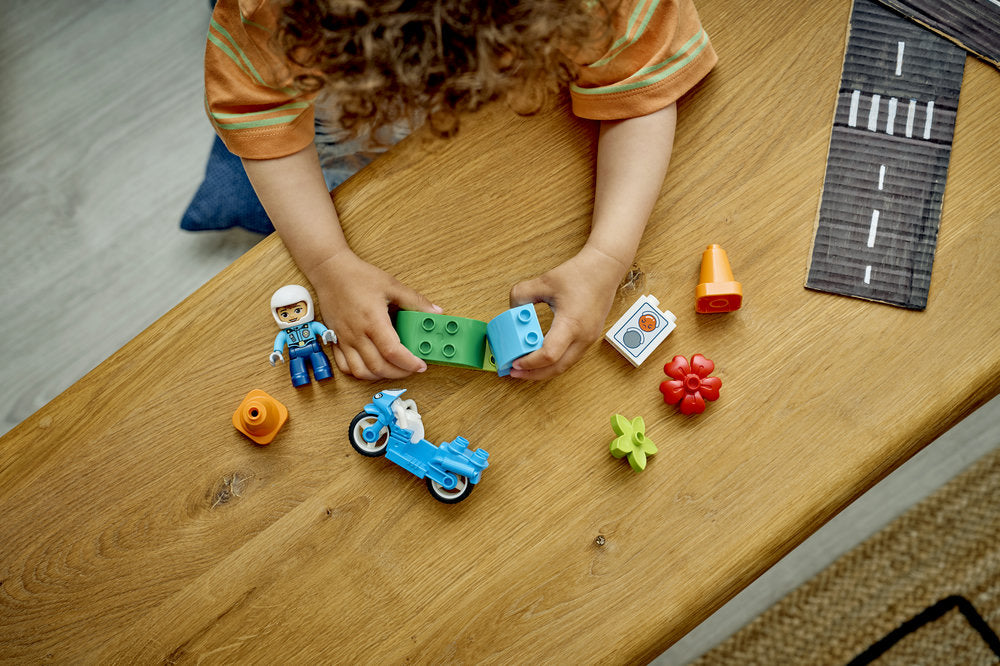 - POLICE TOY FOR CREATIVE PLAY – Toddlers create fun community-helper stories and use fine motor skills to place the police officer on her LEGO® DUPLO® motorbike and drive her around the cones