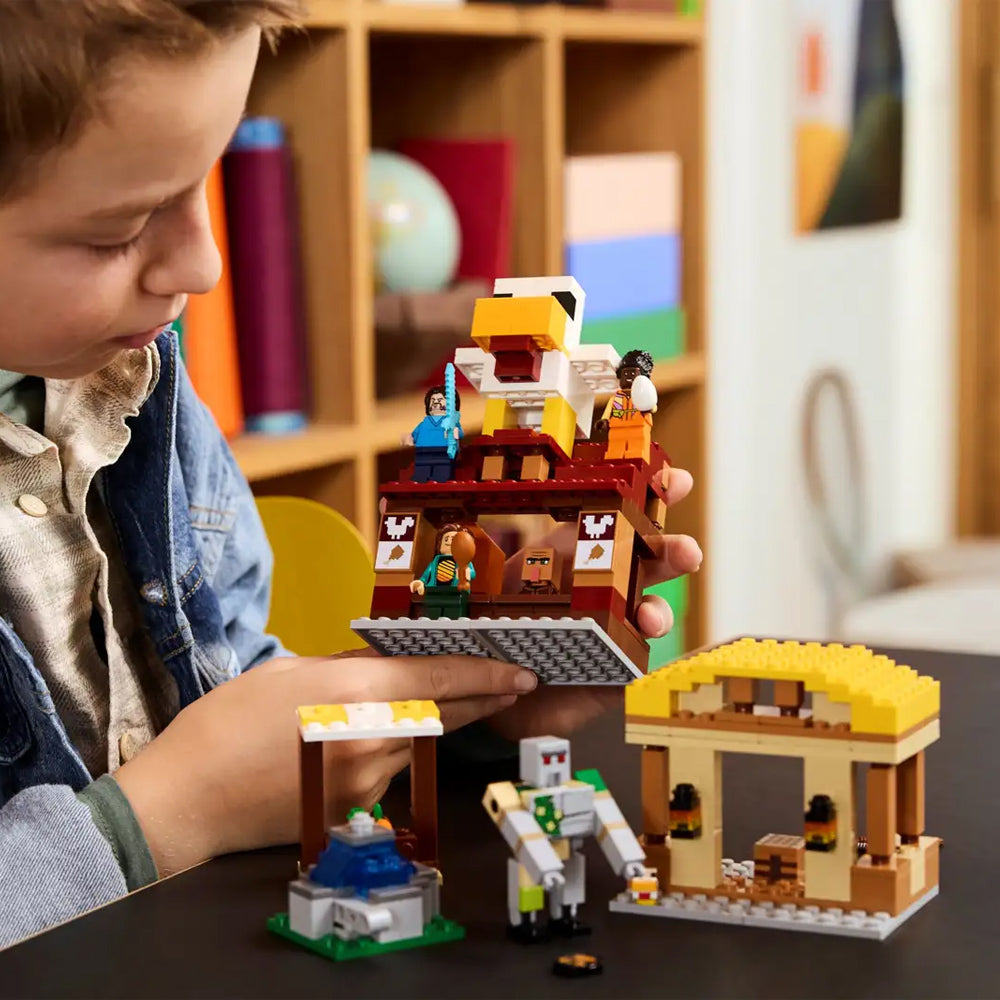 - Video game LEGO® set – When piglins launch missiles from their ghast balloon, causing the fountain to ‘explode’, kids must defend the villagers and Steve's fried chicken restaurant and crafting shack
