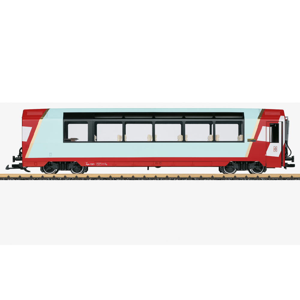 This is a model of a Rhaetian Railroad "Excellence Class" panorama car as it is used in the Glacier Express. The paint and lettering are prototypical for Era VI. The car has a complete interior matching the prototype. It also has built-in interior lighting and ball bearing wheelsets. The doors can be opened. Length over the buffers 68 cm / 26-3/4".