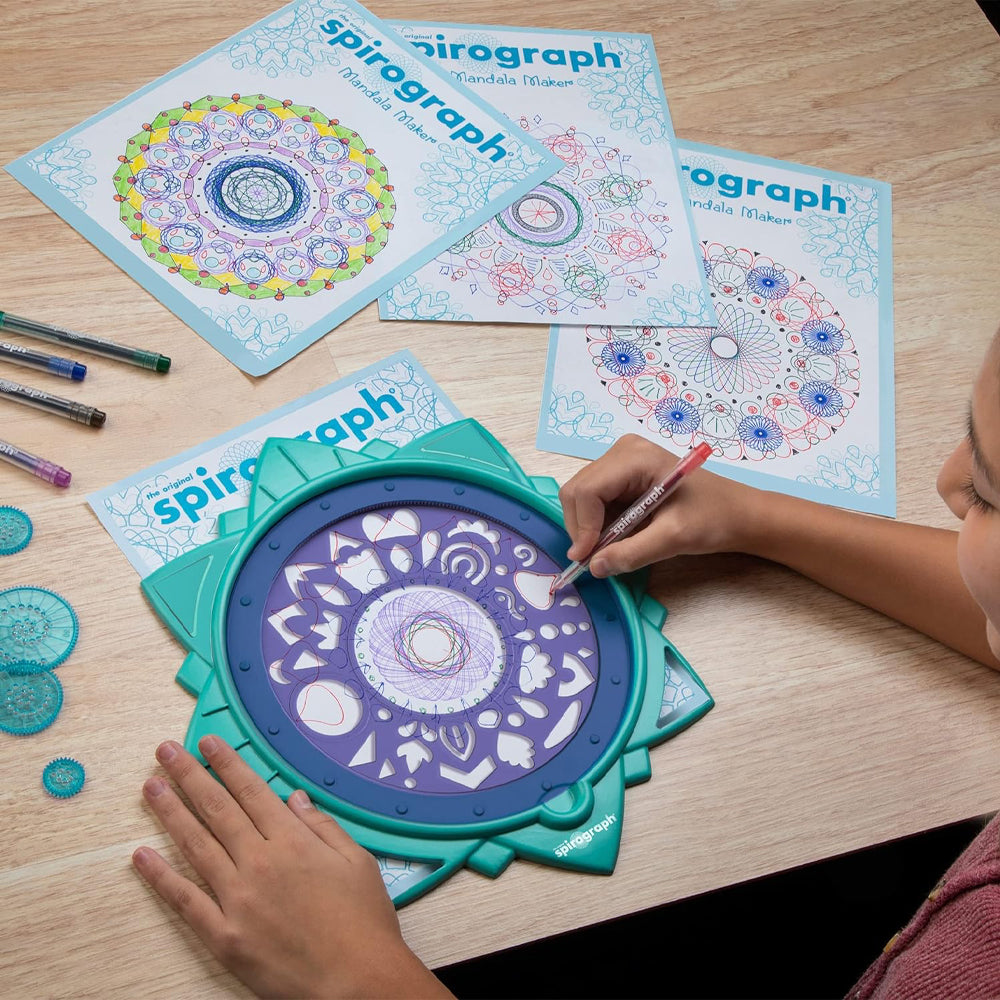 This amazing drawing tool includes traditional Spirograph rings in the centre of each of the interchangeable mandala wheel.