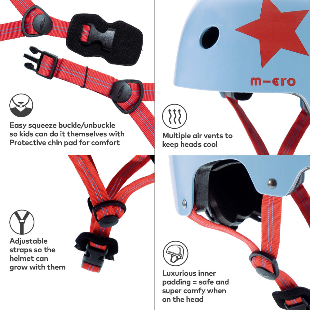 So, our Micro helmets are packed with the latest technology to make safe simple. Our easy squeeze buckle /unbuckle helps little fingers fasten their helmet independently. Our adjustable side locking dividers make it easy to get the right fit first time. And our integrated light - which cleverly doubles as a sizing dial - ensures children are visible when out and about.