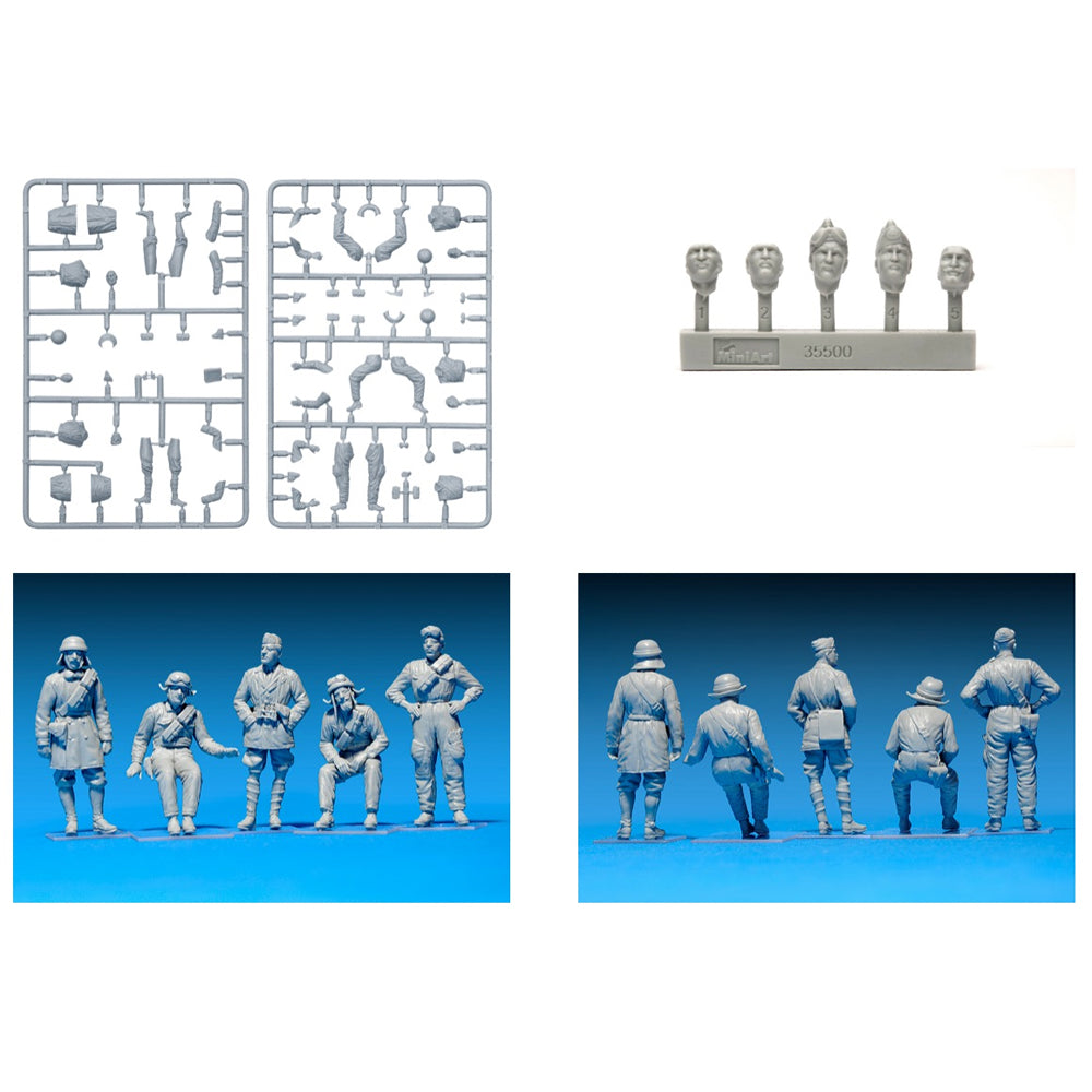 This kit includes five highly detailed figures of Italian tank crew members from World War II, each featuring resin heads for realistic facial expressions. The figures are dressed in a mix of uniforms, suitable for different climates and campaigns.