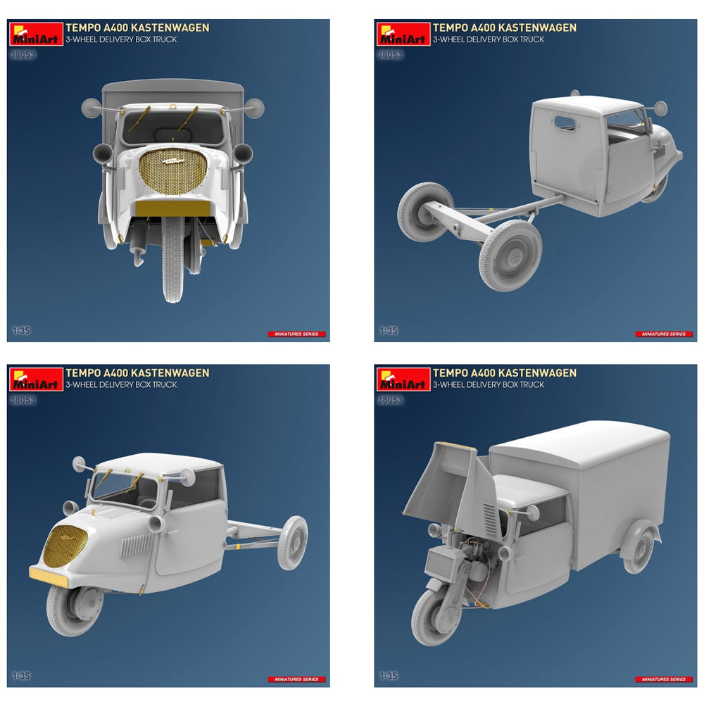 Plastic Model Kit 1:35 Scale This detailed kit features the Tempo A400 Kastenwagen, a classic 3-wheel delivery box truck.