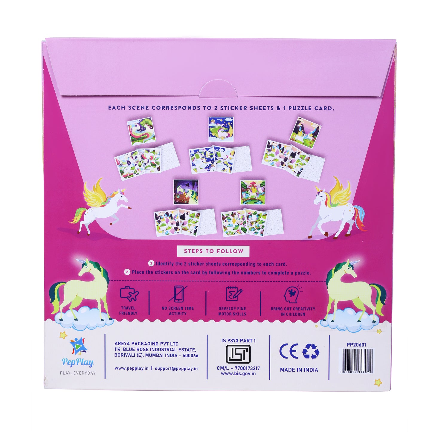 _x000D__x000D_Join the unicorns in their adventurous journey to a magical land where unicorns sleep under starry skies, graze in sunny meadows, fly around a majestic rainbow, roam in the mystical gardens and shine in the crystal caves with this amazing sticker puzzles set. This pack of 5 sticker scene is fun and exciting.