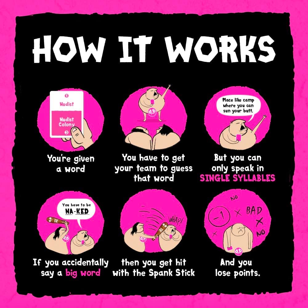 15 Minutes to Play, 2-5 Players, Ages 17 and Older - Includes instruction manual, 200 cards, 1 sand timer, 2 game boards, and 1 inflatable Spank Stick.