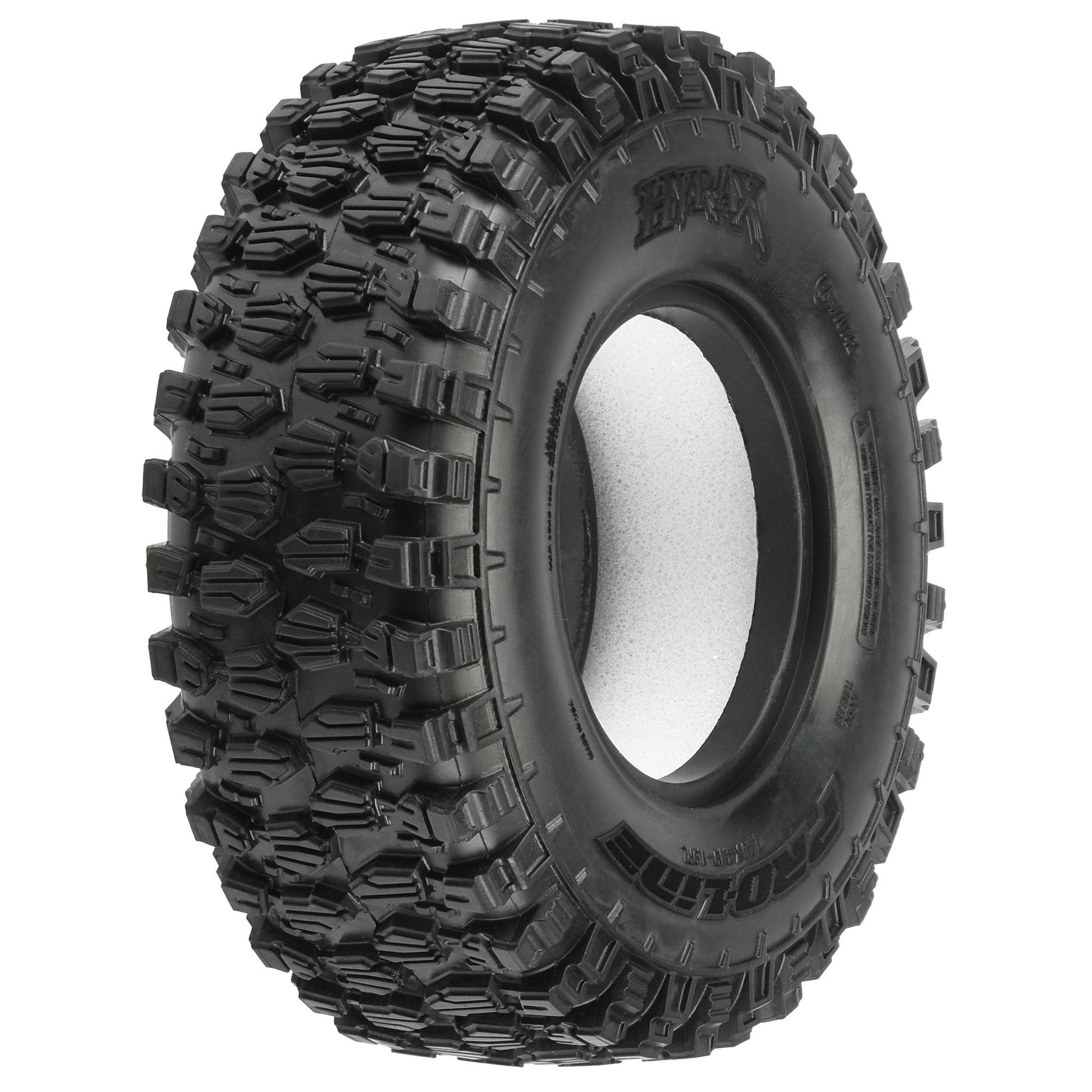 This is a pair of Class 1 Hyrax 1.9" Rock Crawling Tires. The future of Class1 Tire Performance has arrived with Pro-Line's 1.9" (4.19" OD x 1.4" Width) Hyrax Tire! Designed from the ground up for maximum grip on the toughest terrain, the Class 1 legal Hyrax tire is ready for anything your Scale Adventure might throw at you. The Hyrax features an aggressive and open tread pattern with each tread block containing multiple Sipes for incredible tread flex while still looking great on a Scale Rig. The highly detailed connected tread on the sidewall of the Hyrax extends out for unmatched side-hilling performance and the futuristic stepped tread blocks create even more forward gripping edges that dig into slick rock like no other scale tire Pro-Line has produced to date! The Hyrax is made from Pro-Line's Legendary G8 material, so you know it provides performance you can depend on.