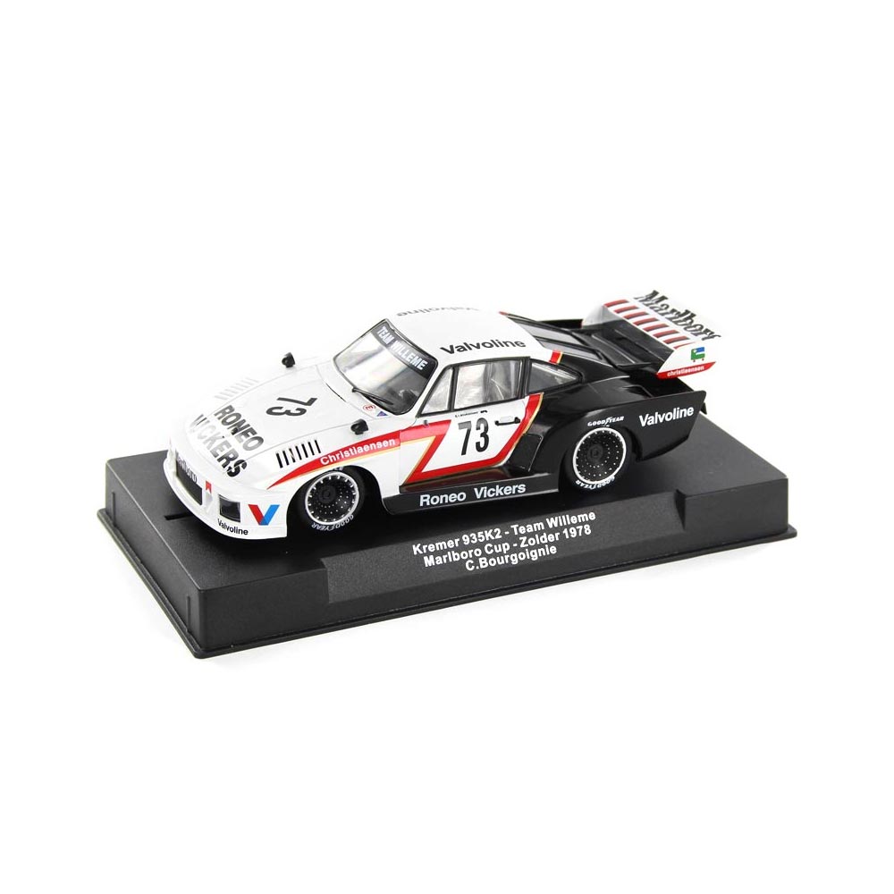 Sideways Kremer Porsche 935/K2 Slot Car. RCSW55 is a model of the Group 5 Kremer Porsche 935/K2. This Team Willeme, Marlboro/Roneo Vickers sponsored car was driven in the Marlboro Cup at Zolder in 1978 by C Bourgoignie . The adjustable sidewinder chassis features a separate motor mount fitted with a 20.000 rpm flat 6 motor. Most of the parts are supplied by Slot.it.