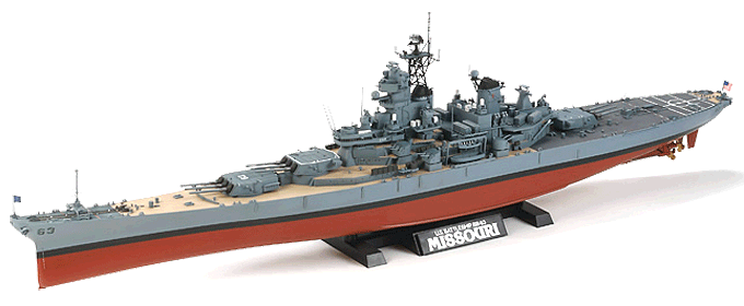 The USS Missouri (BB-63) was the third ship of the Iowa-class and was commissioned in 1944. During the Pacific War, she supported attacks on Kyushu and Okinawa and then participated in actions such as the bombardment of Muroran in Hokkaido. It is a well-known fact that the signing ceremony of Japan's surrender documents took place on the Missouri's decks on September 3, 1945. Following the end of the Korean War, the Missouri was mothballed at the reserve fleet anchorage but was refitted with, various, modern equipment to rejoin the U.S. Navy in 1986. Following Iraq's invasion of Kuwait, the Missouri and her sister ship Wisconsin were deployed to the Middle East and she helped conduct the first firing of Tomahawk cruise missiles in combat during the opening stages of the Gulf War. The Tamiya model kit faithfully depicts the Missouri as she appeared in 1991. New parts have been tooled to update the kit.
