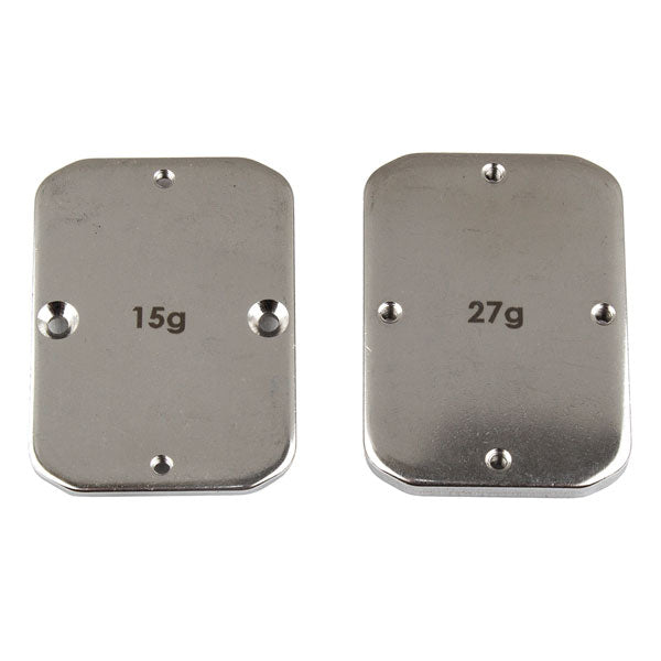 These 15 gram and 27 gram chassis weights key into the front chassis pocket. Adds weight to the front of the B64 and B64D, giving more steering in high-grip applications. Mounting hardware included.