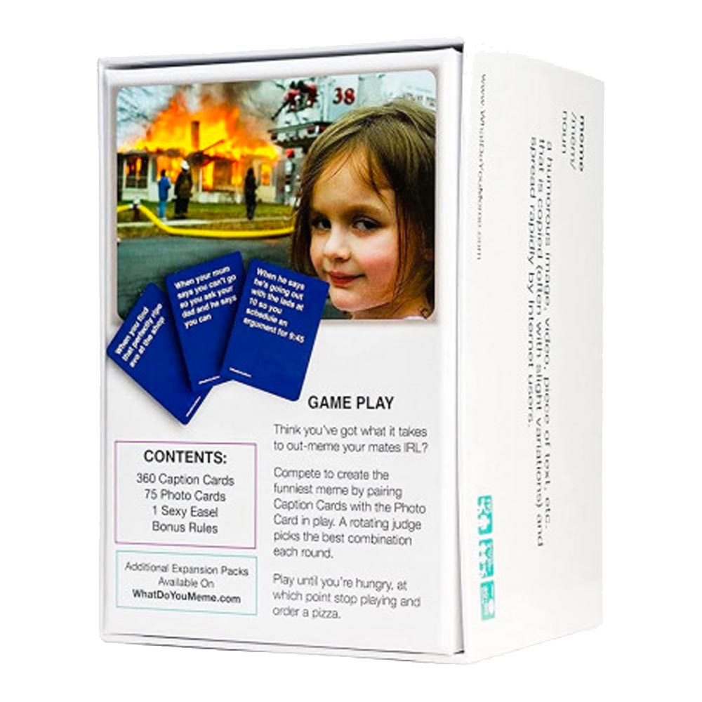 WHAT’S INSIDE: Each What Do You Meme core game contains 435 cards. 360 of these are caption cards and 75 are photo cards. Printed on premium playing cards (thick with gloss finish); includes easel and bonus rules, shrink-wrapped in a custom box.