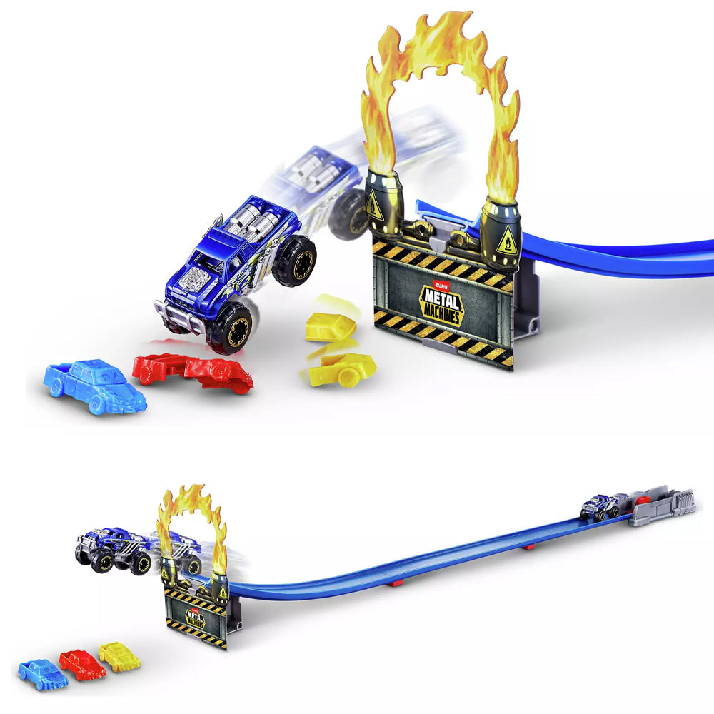 Stunt Ramp and Loop: This set includes a stunt Ramp that allows your Monster Truck to jump over (or on) the stunt cars! After flying down the track your metal machines car goes around the loop, even going upside down. Then over the stunt ramp through the fire.
