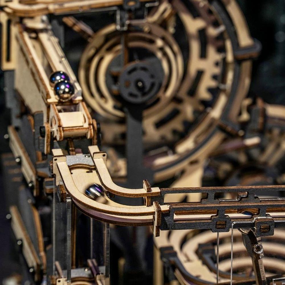 Breakthrough material restrictions and incorporate high-transparent acrylic. With a funnel-shaped track, the total length is extended to 2.5 meters. Rotate the handle, the steel ball will reciprocate along the track to experience the creativity of precision machinery with this wooden marble run puzzle.
