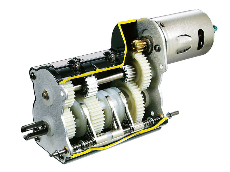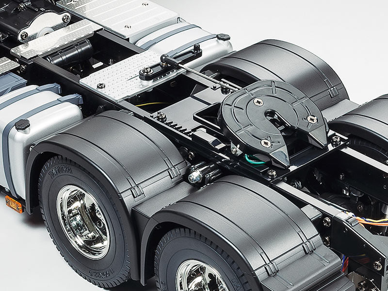 The Tamiya rendition faithfully captures the truck's modern form with the use of ABS plastic body parts and a number of metal chassis components. One look at the detailed interior and auxiliary equipment, such as air tanks, will confirm that the body features replica-quality realism, which is further enhanced with metal transfers depicting emblems and numerous metal-plated parts. The chassis is built for durability as it uses aluminum side channels with resin cross members. Drivability is accomplished by power from the front-mounted motor and is transmitted via a propeller shaft to the rear axle; built-in differential gears guarantee smooth cornering. Gear changes can be made via a separately-sold Tamiya 4-channel transmitter.